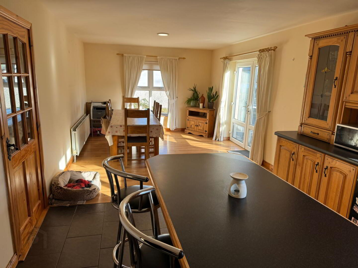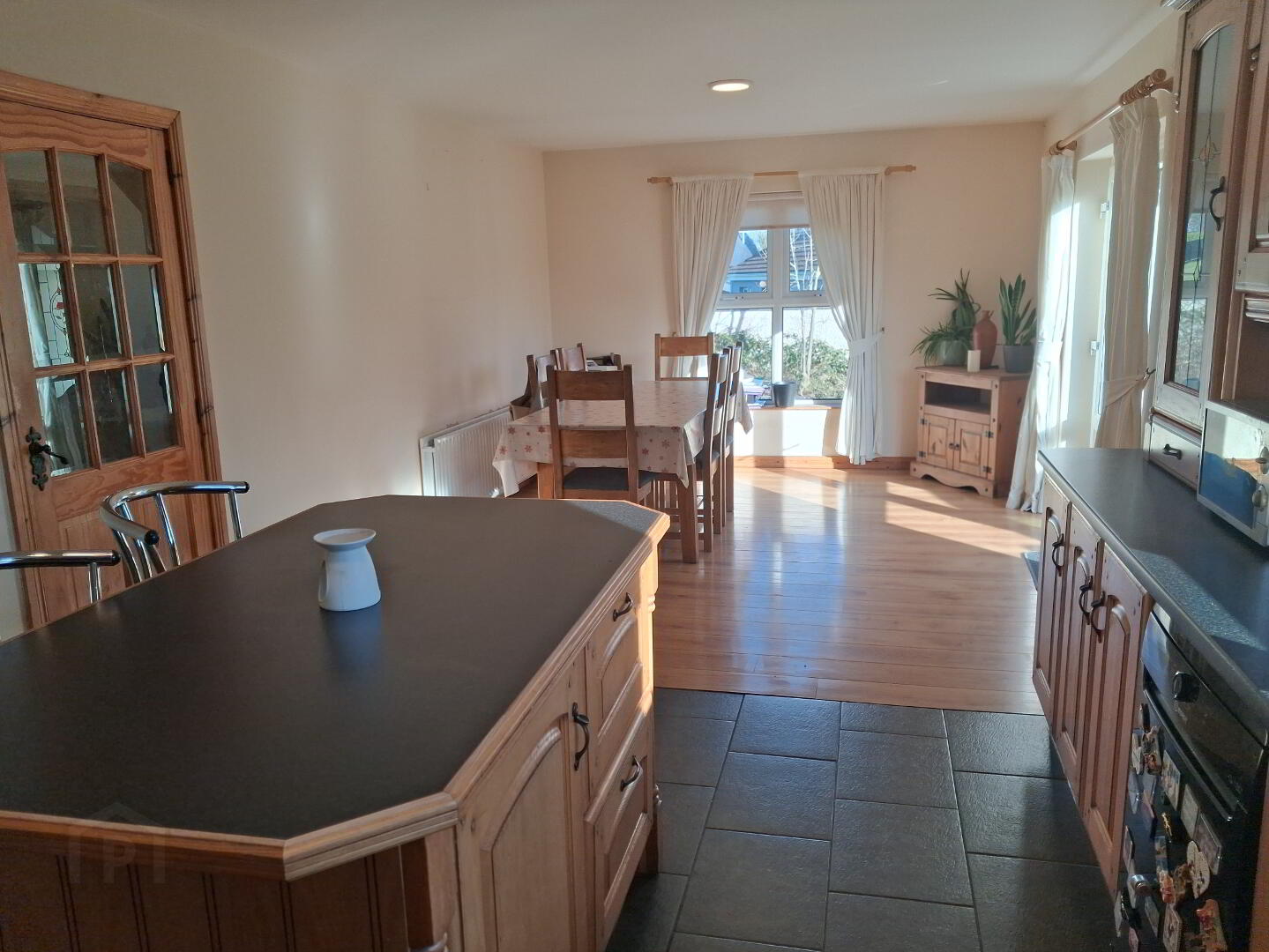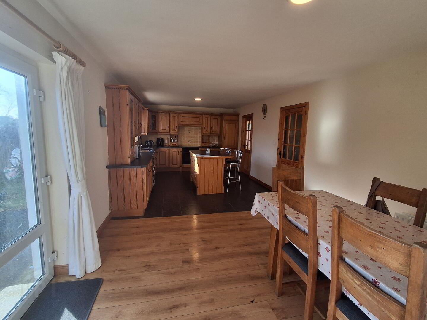 8.60M X 3.58M Full fitted modern units with a beautiful island, 'Logik' 4 ring hob (recently installed) and 'Bosch' electric oven, Integral 60/40 fridge freezer, 'Indesit' dishwasher, stainless steel sink, hardtile floor with wooden flooring to dining area, PVC patio doors.