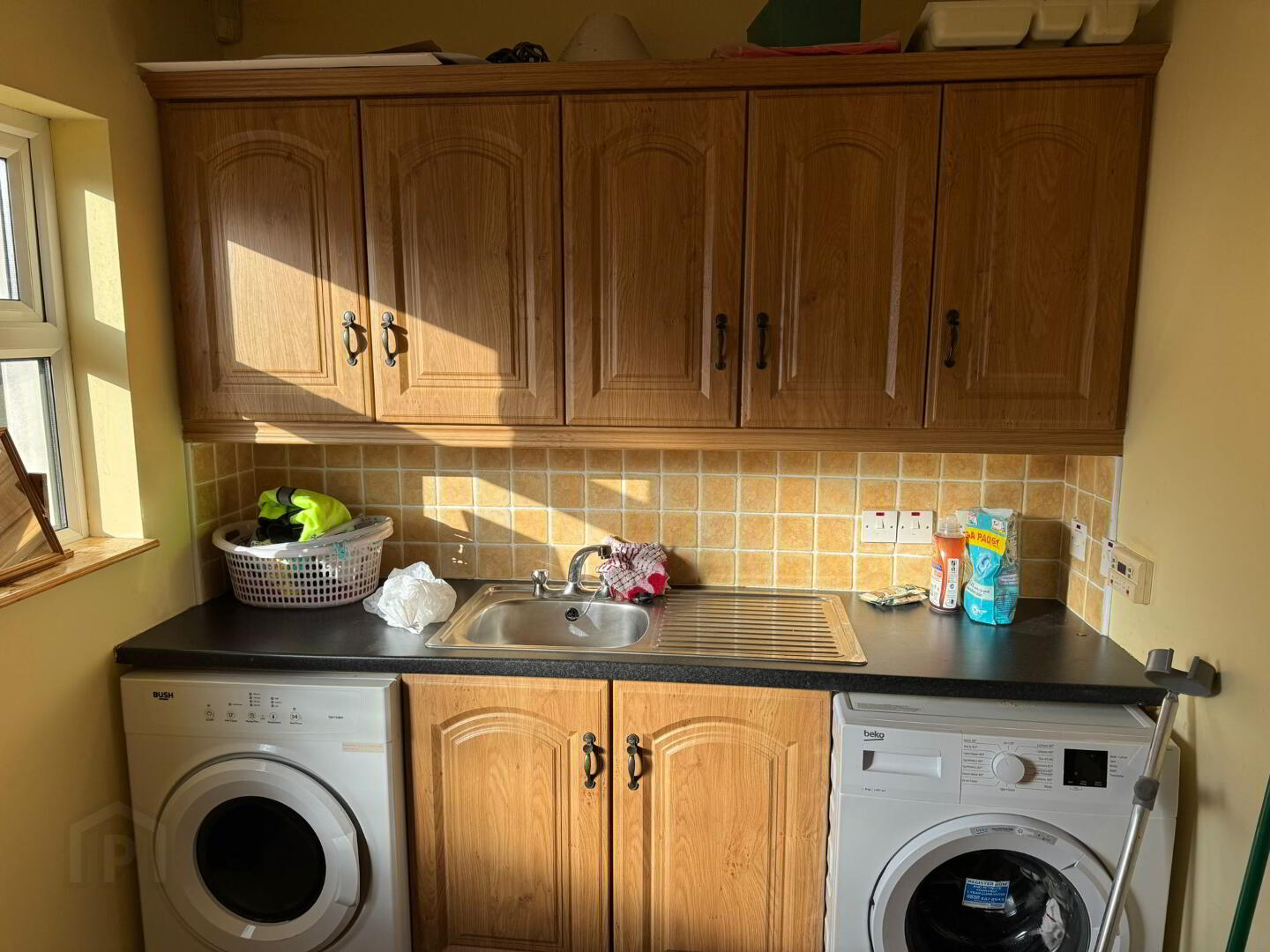 2.29M X 2.16M Full fitted units, hard tile floor, 'Beko'washing machine and 'Bush' tumble dryer, decorative glass in door between kitchen and utility.