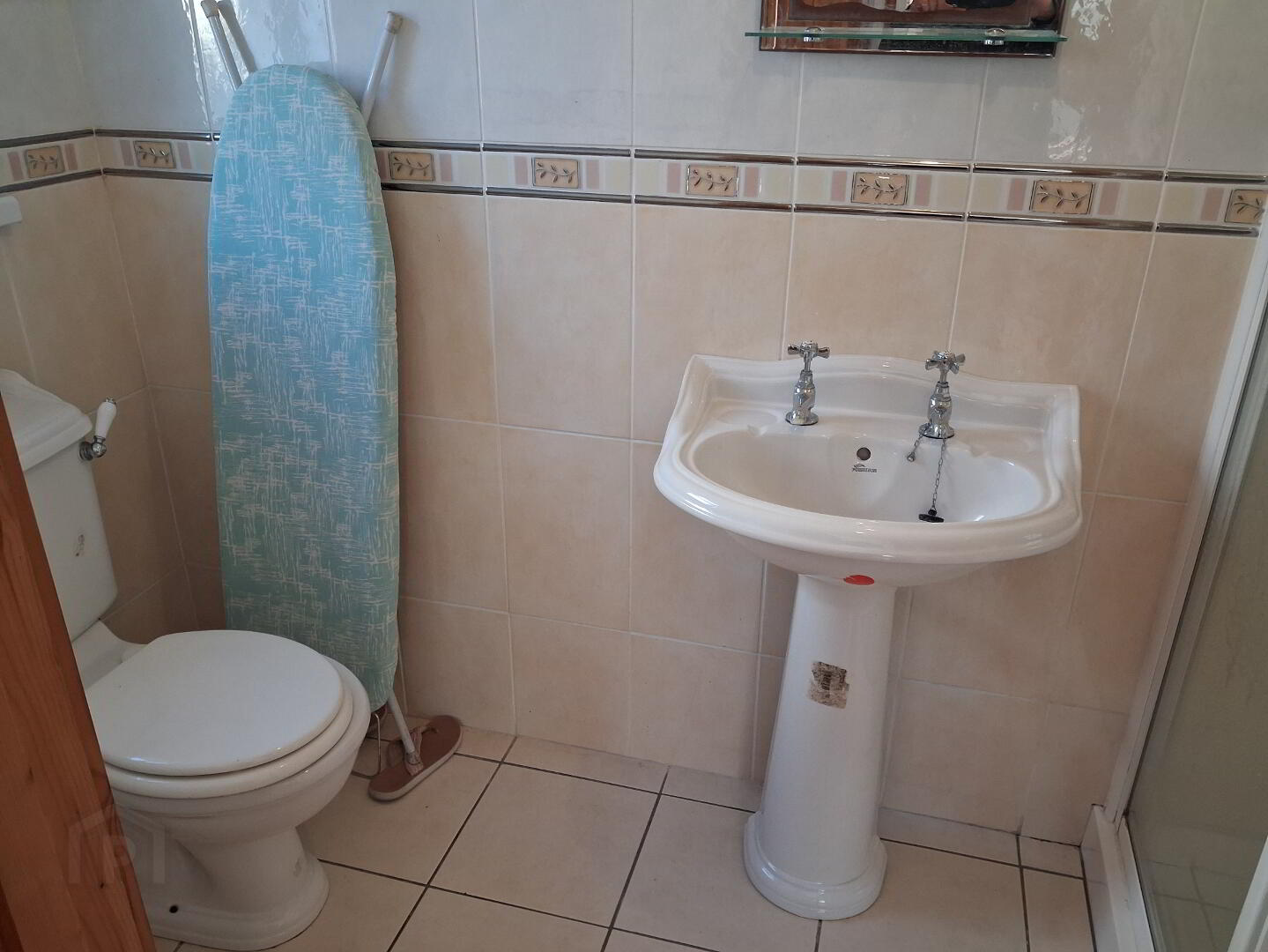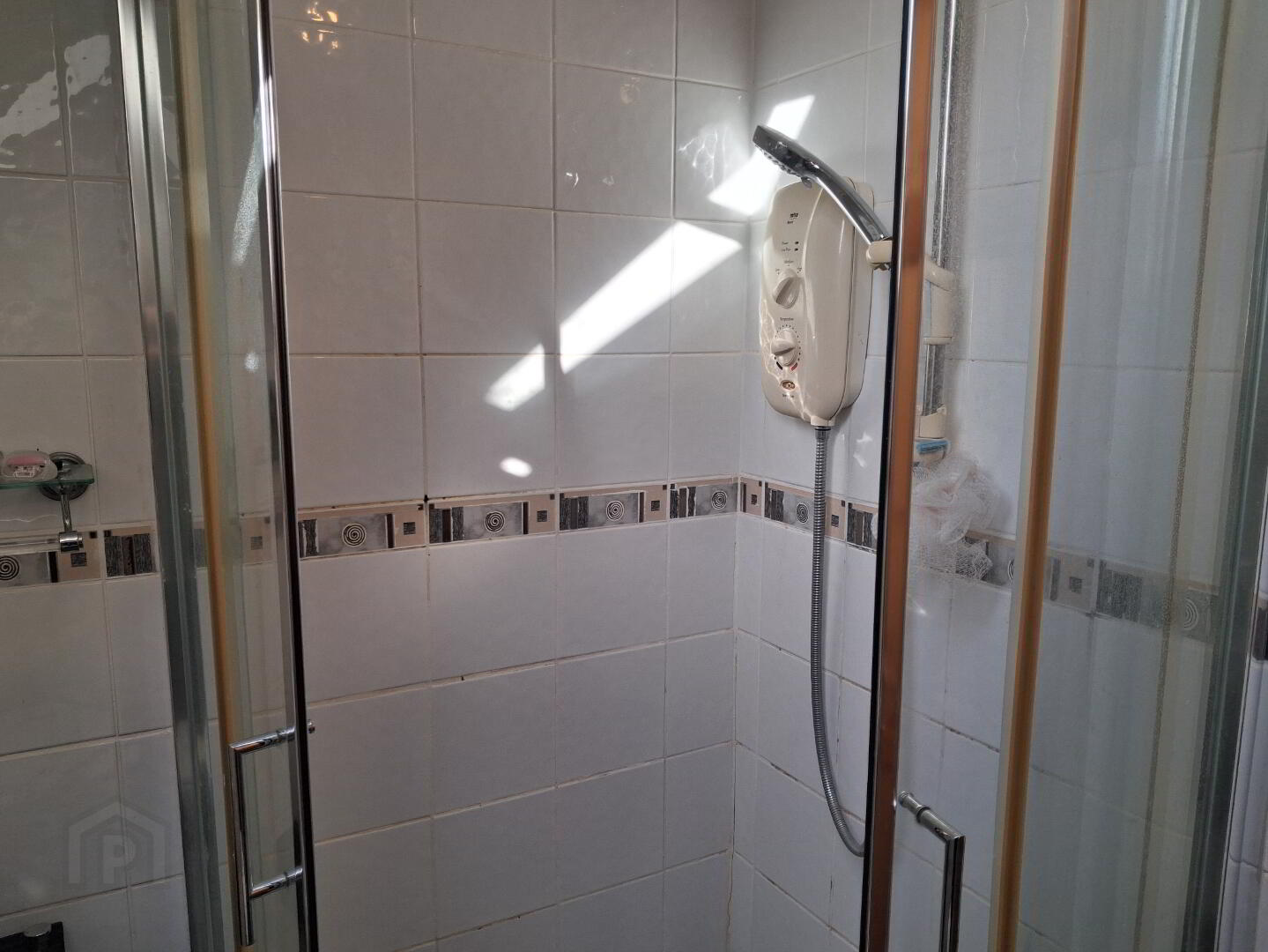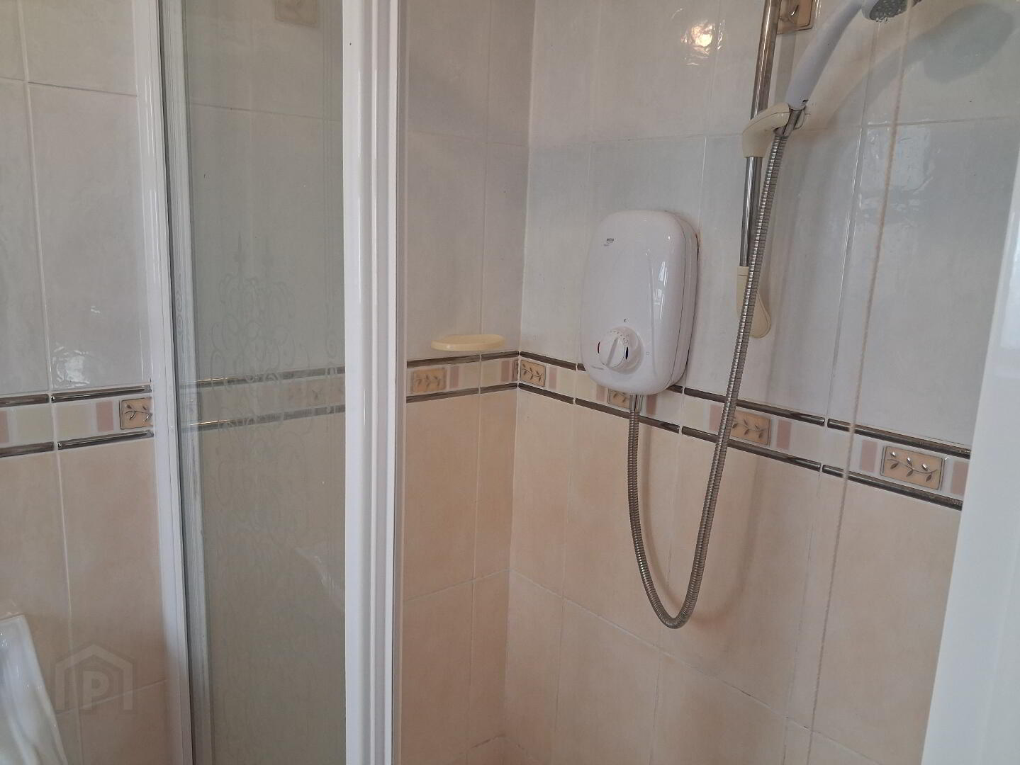 2.63M X 1.18M Wc, wash hand basin and 'Mira Vigour' shower in self contained cubicle, walls tiled floor to ceiling, hard tile floor.
