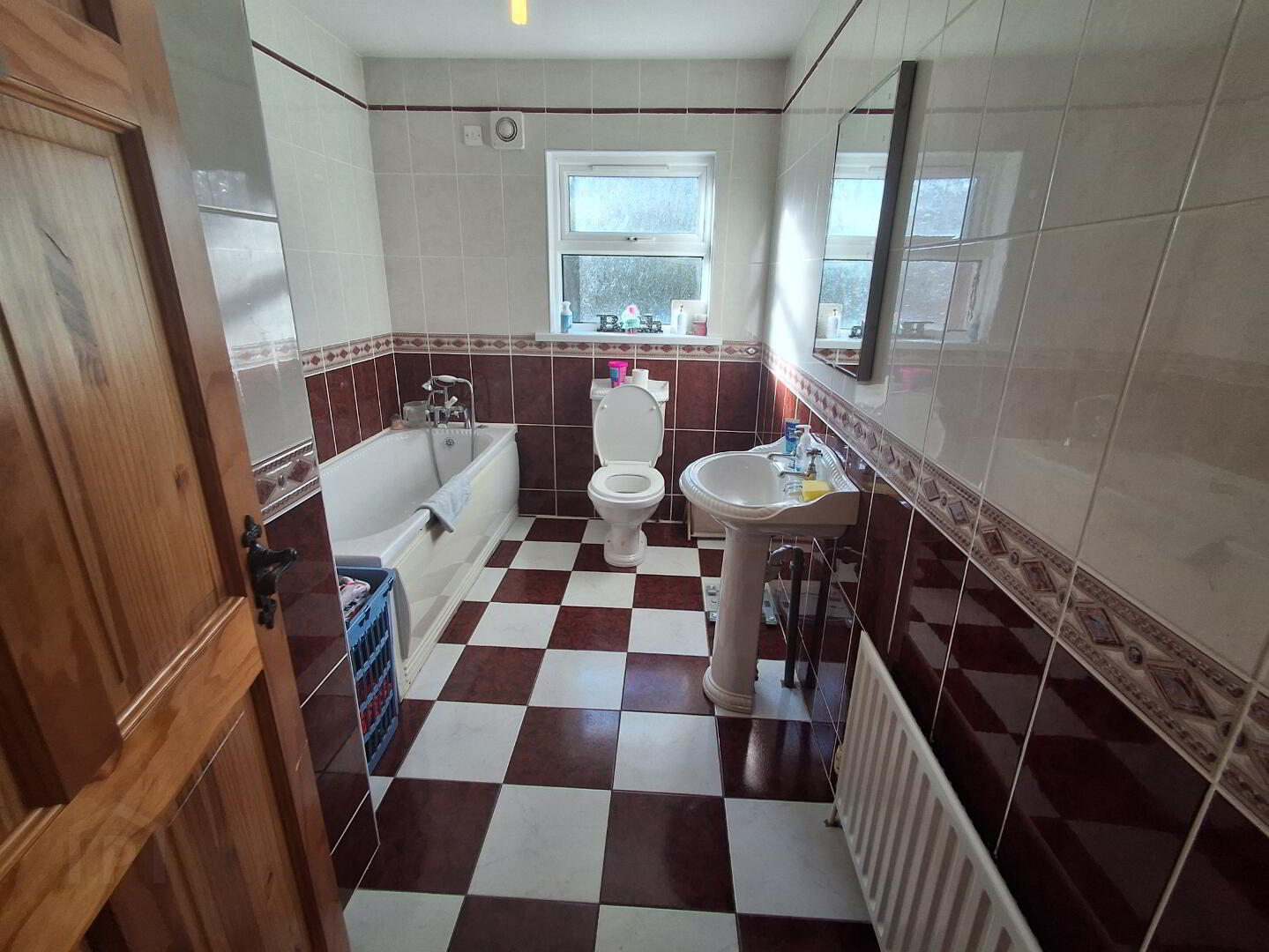 3.25M X 2.06M Wc, wash hand basin and bath with decorative chrome taps and shower head, walls tiled floor to ceiling, hard tile floor.