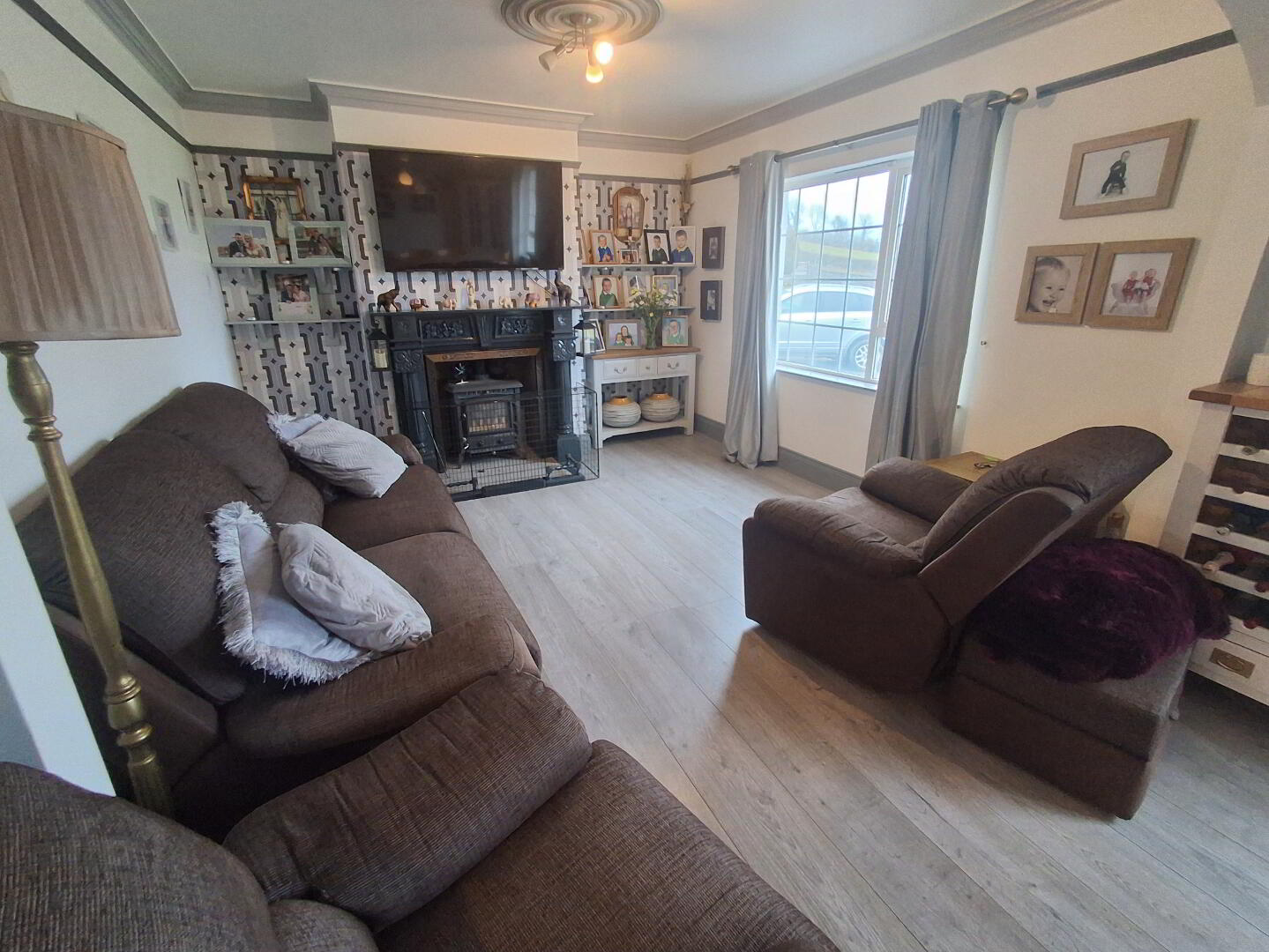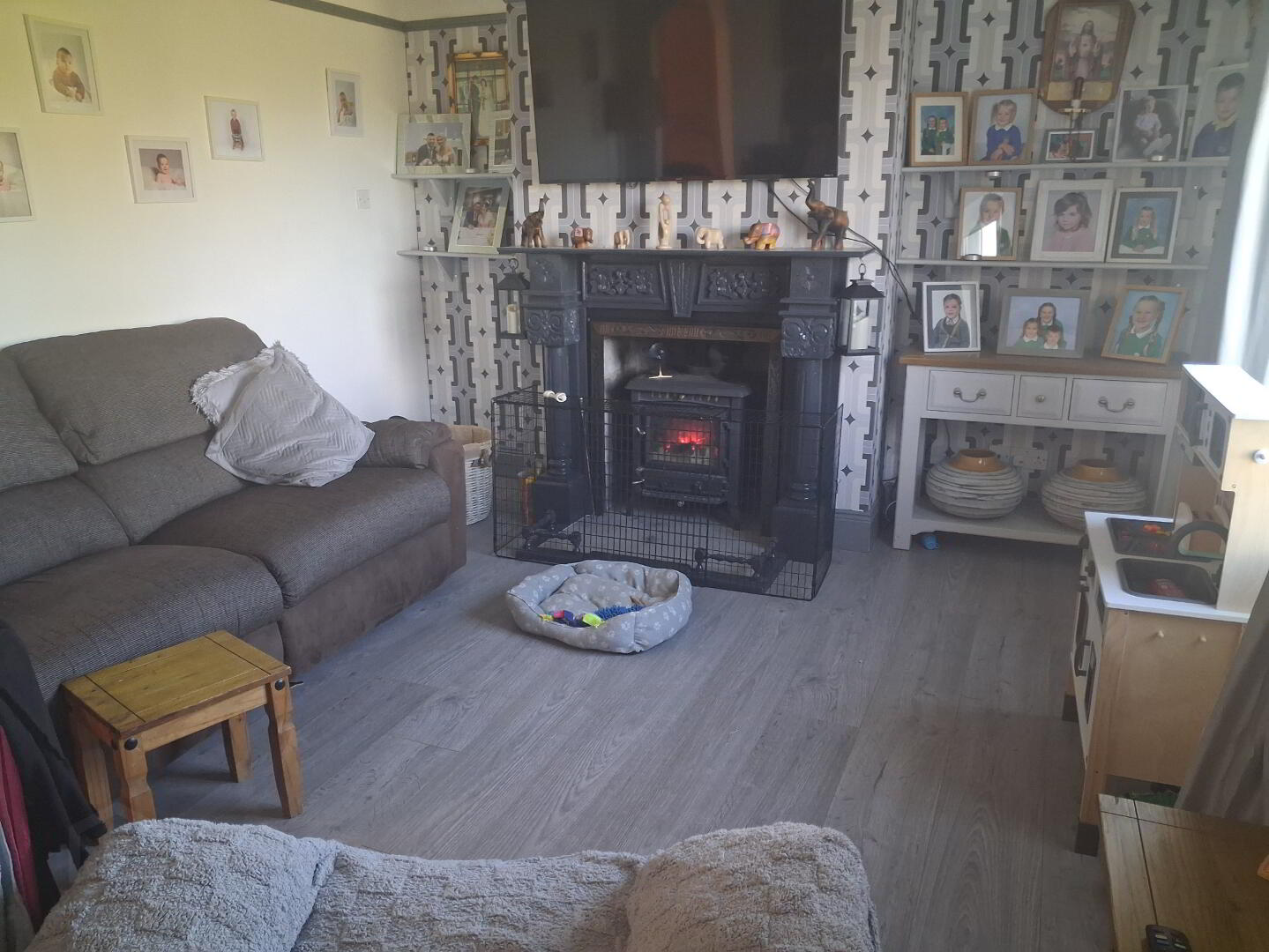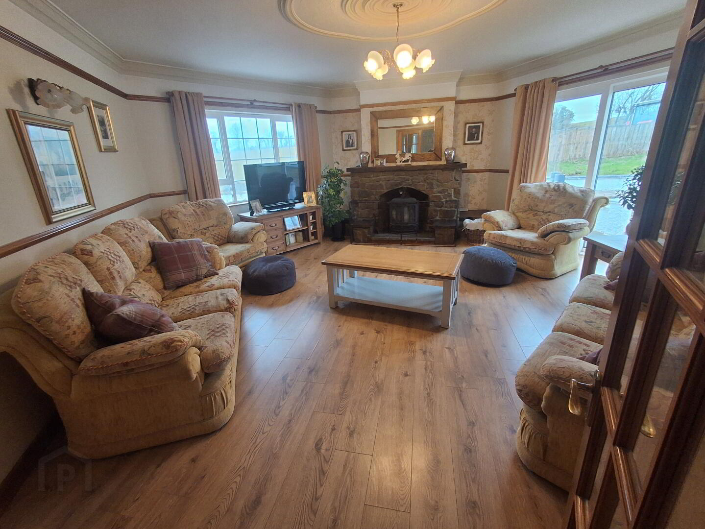 Sitting room: 6.14m X 6m (at widest) - Beautiful log burning stove set in a decorative stone built fireplace, PVC patio doors, cornice and coving to ceiling with gorgeous chandelier style light, elegant french doors with glass leading to hallway which leave a lovely bright room.