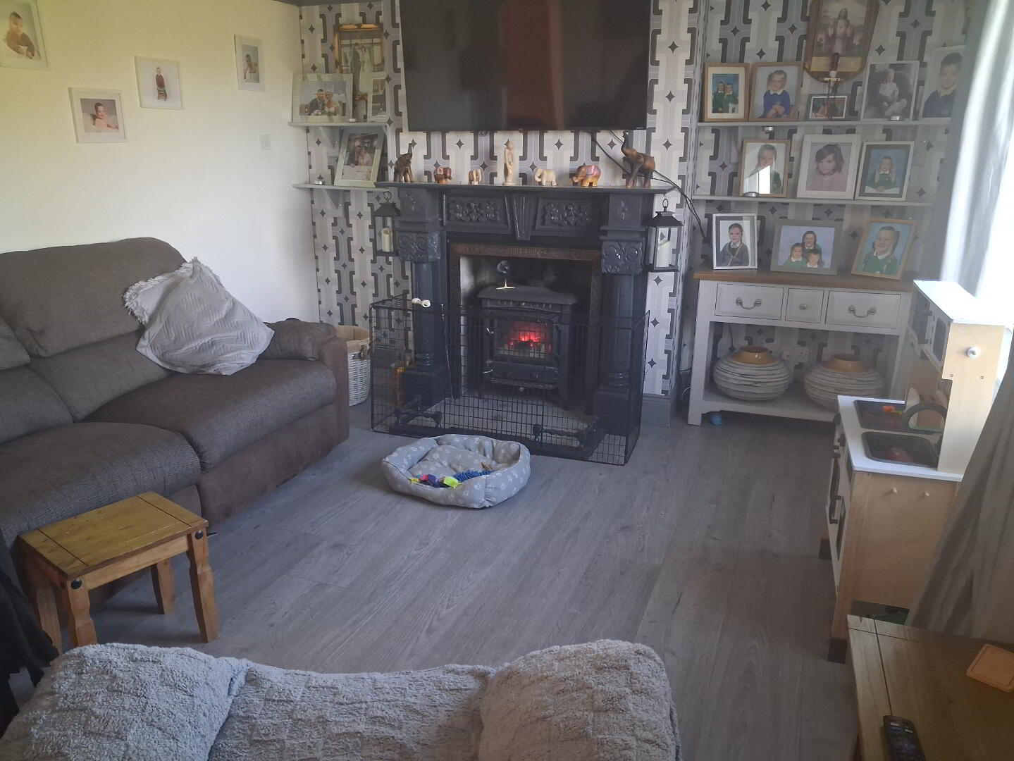 Spacious living/Kitchen/diner : 4.09m X 3.28m & 7.23m X 3.6m - Fully Fitted modern kitchen incorporating high and Low Level Units with some glass display cupboards, 4 ring electric hob and fan assisted oven, stainless steel sink, hard tile floor, fully tiled splashback, recessed lighting. Living/dining area with wooden floor and a beautiful log burning stove set in a decorative fireplace.
