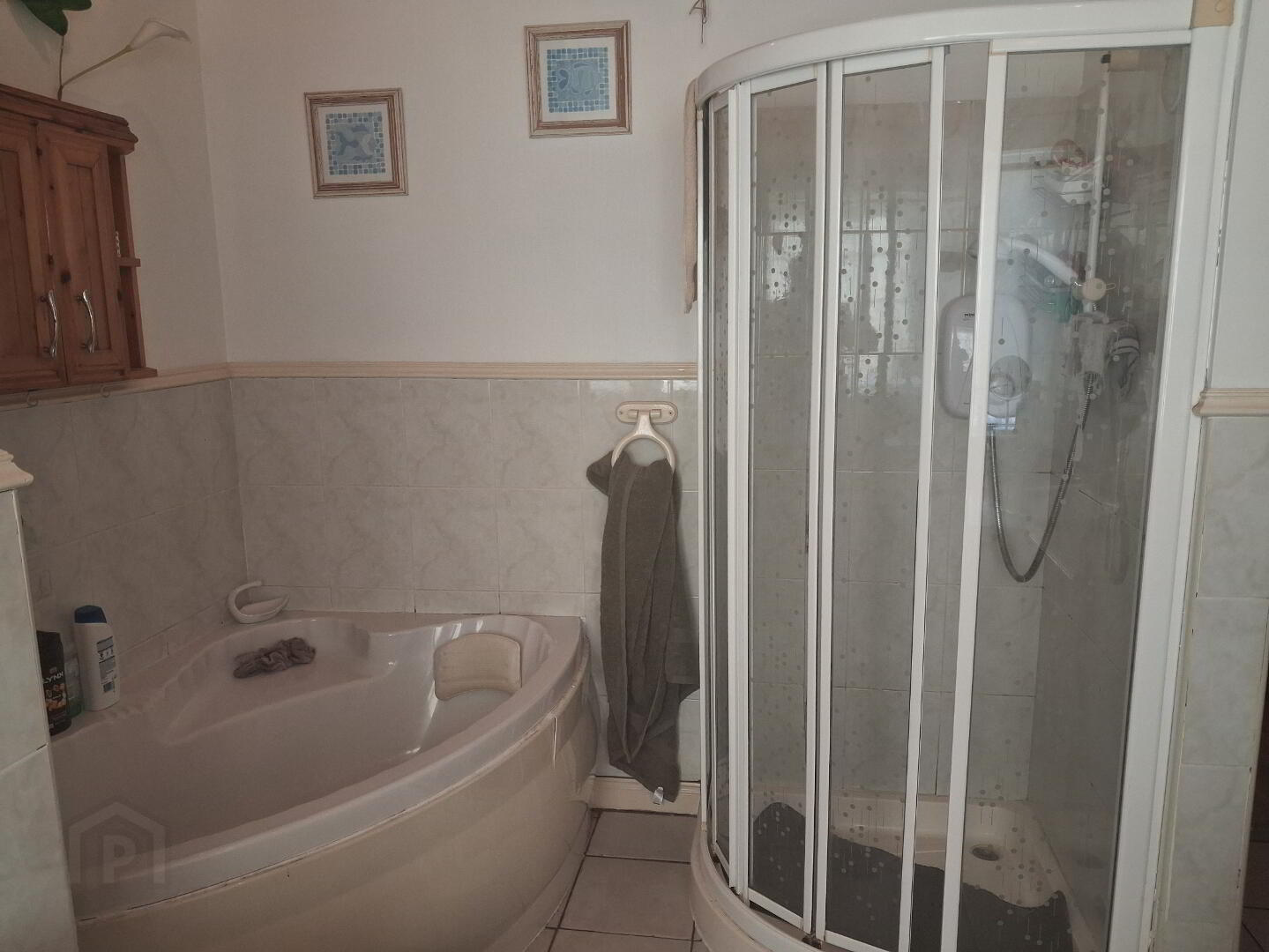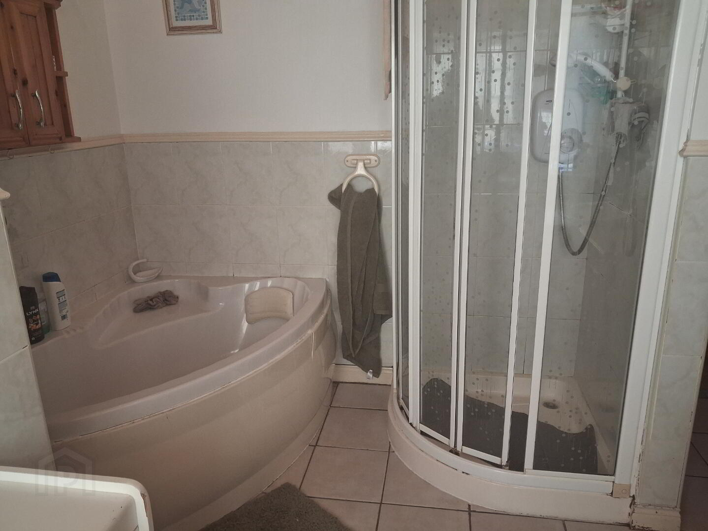 Bathroom: 3.51m X 3.28m - white sanitaryware incorporating wc, wash hand basin and corner bath, 'Mira Vigour' shower in self contained cubicle, hard tile floor, walls tiled to dado rail, tongued and grooved timber ceiling with recessed lighting.